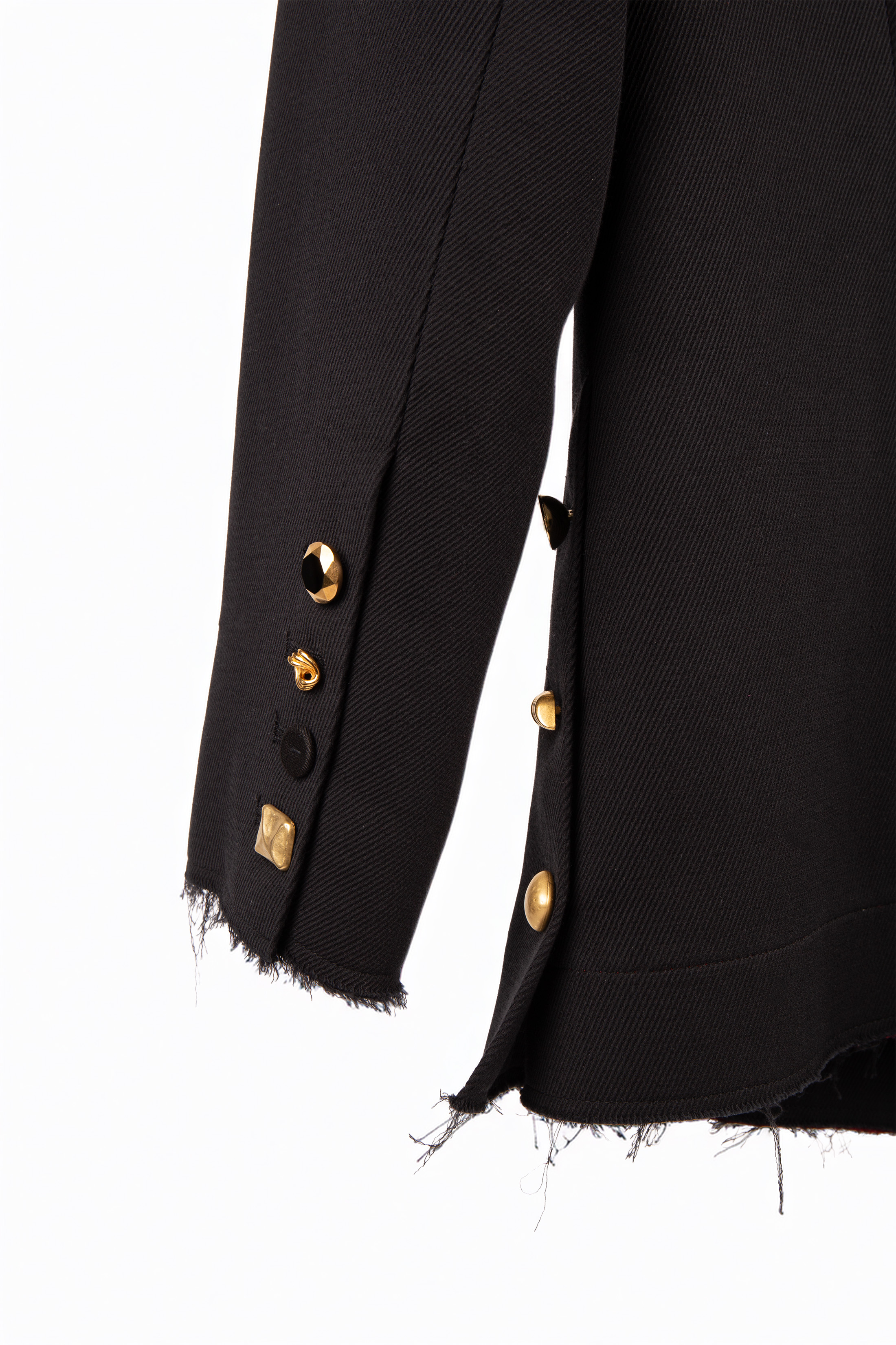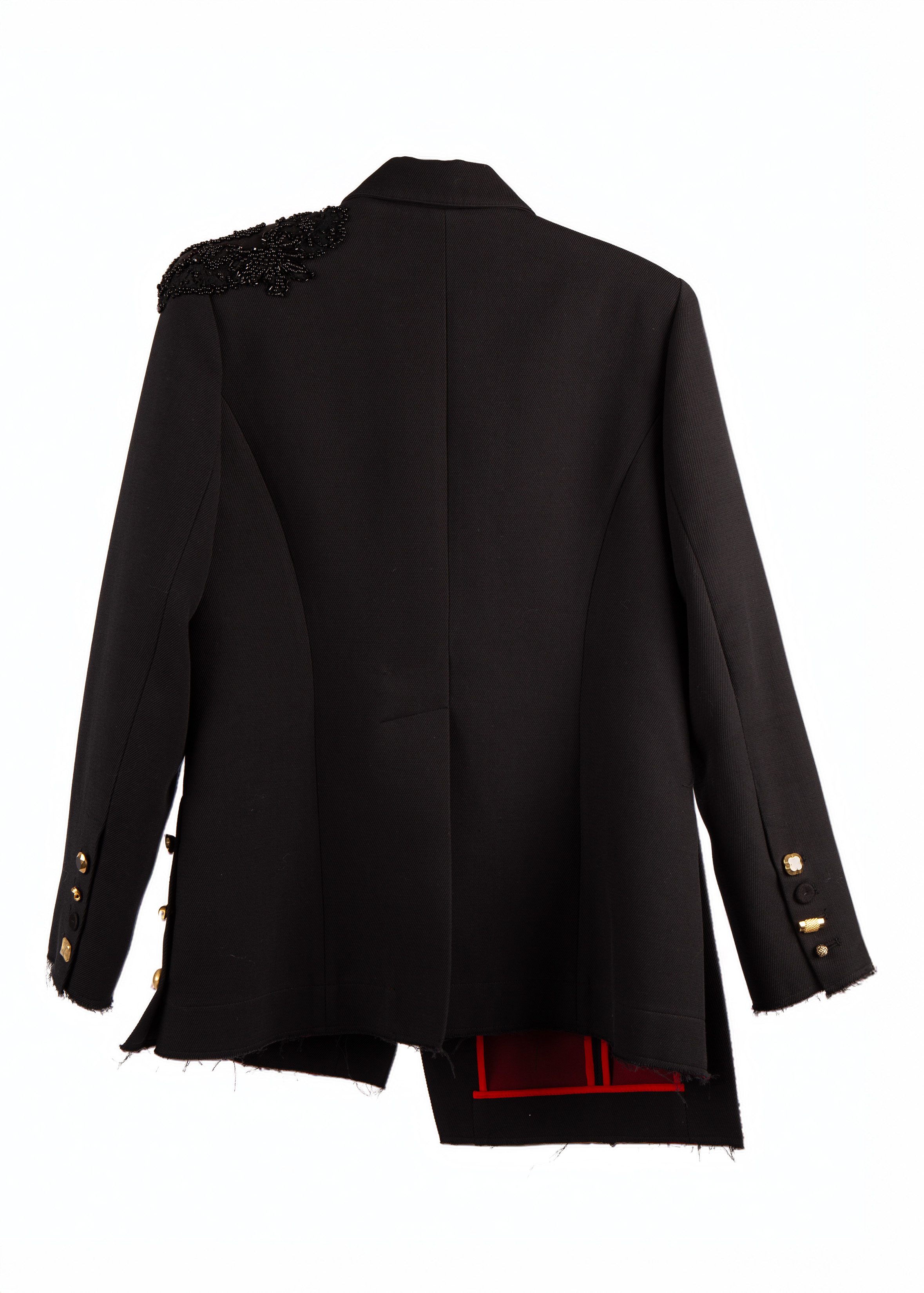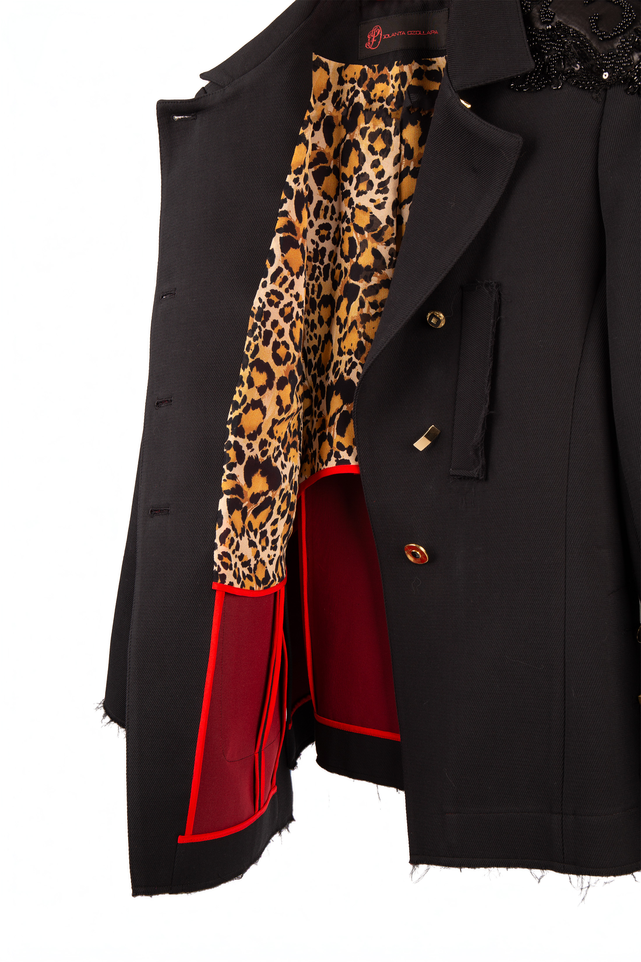 Asimetriska melna žakete ar izteiksmīgu raksturu. Vilnas audums apvienots ar zīda apdari un viskozes oderi leoparda rakstā, piešķirot kontrastu starp klasiku un mežonīgu šarmu. Neapšūtās malas, pārbīdītās pogas un viens grezni izšūts plecs piešķir tērpam māksliniecisku, nedaudz dumpīgu noskaņu. Moderns spēks, kas nepielāgojas – ideāli sievietei ar stilu un attieksmi.