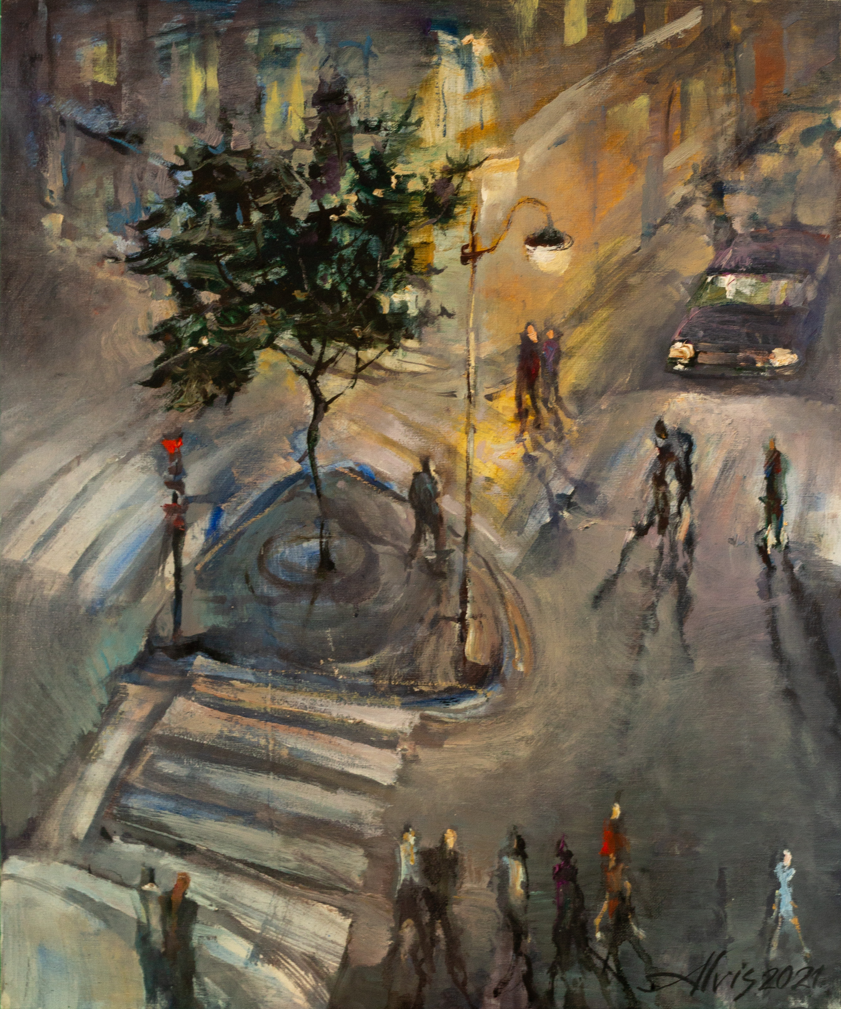 Картина «Перекрёсток в Париже» латвийского художника Альвиса Земзара изображает шумный вечерний перекрёсток под мерцающими фонарями и надвигающимся сумраком. Оригинал 2021 года, масло на бельгийском льняном холсте размером 60 × 50 см. Живые, свободные мазки в оттенках сланцево‑серого, умбры и мягкого золота передают ритмичный поток пешеходов и транспорта, а центральное дерево и фонарный столб добавляют композиции структурной устойчивости. «Перекрёсток в Париже» привнесёт в вашу коллекцию динамичную городскую энергию, наполненную поэтическим настроением.